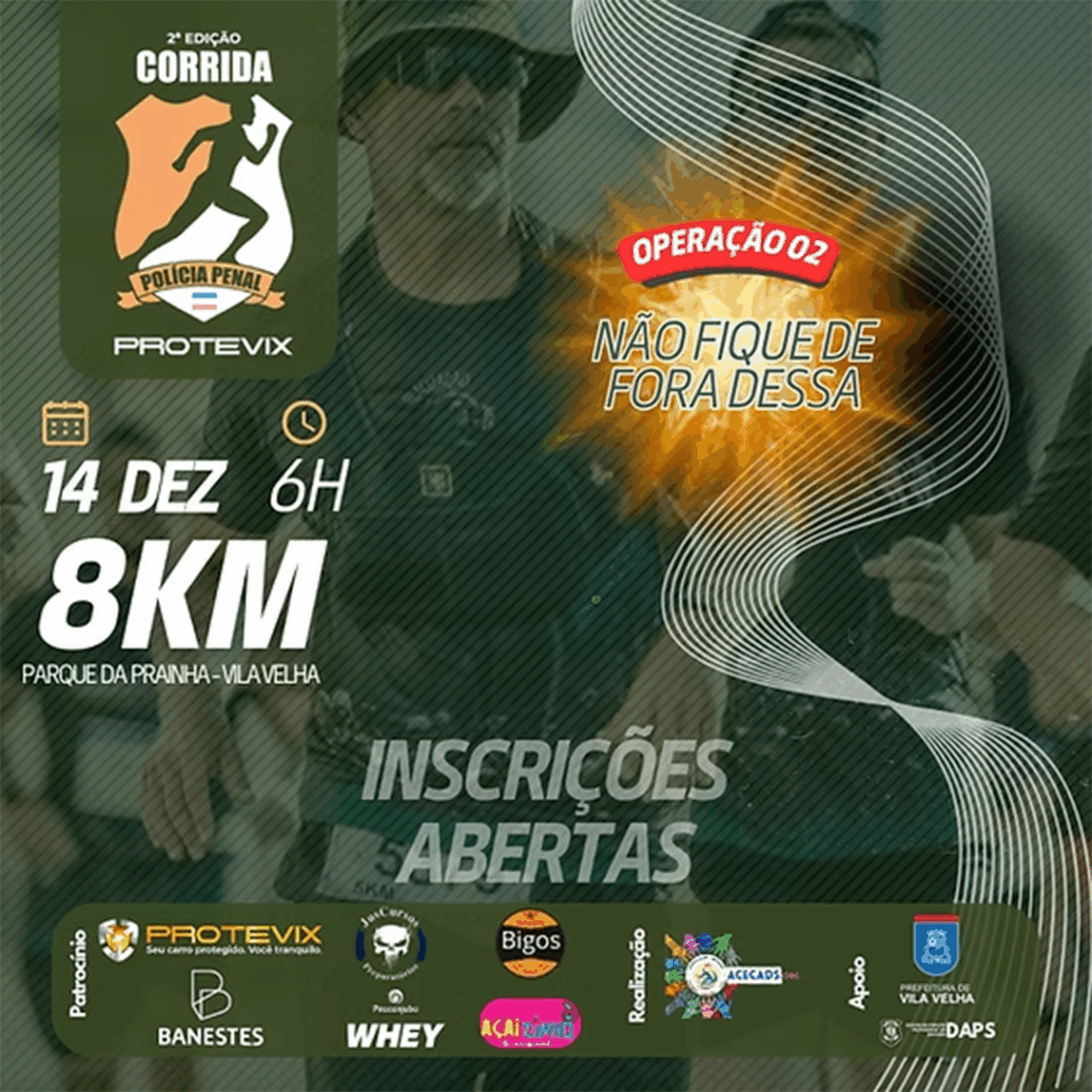 CORRIDA POLÍCIA PENAL PROTEVIX - 2ª EDIÇÃO Patrocínio FAÇA SUA INSCRIÇÃO Horário e Local 14 de dez. de 2025, 06:00 – 11:30Prainha, R. Bernardo Schineider, 357-443Centro de Vila Velha, Vila VelhaES, 29100-170, Brasil FAZER INSCRIÇÃO REGULAMENTO DA COMPETIÇÃO BAIXAR O REGULAMENTO PERCURSO 8KM – LARGADA E CHEGADA NO PARQUE DA PRAINHA. CONTORNANDO O MORRO DO MORENO. FAZER INSCRIÇÃO medidas dos uniformes FAZER INSCRIÇÃO
